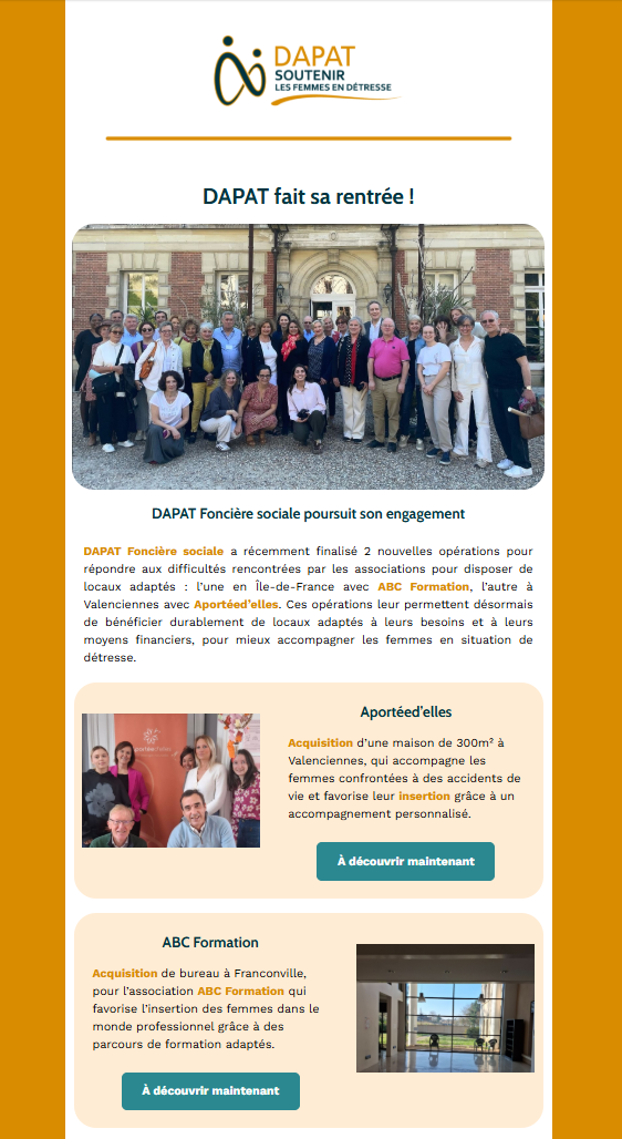 DAPAT soutient les associations qui accompagnent les femmes en détresse, qu’il s’agisse de précarité, de violences, de migrations ou d’accidents de la vie. Ensemble, nous luttons contre l’isolement et la pauvreté et favorisons leur reconstruction et réinsertion.